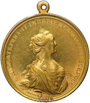 M.E.Diakov. Medals of the Russian Empire, part 2: 1725-1796, Moscow, 2005, 123.1 Obverse: Б. М. ЕКАТЕРИНА . II. IМПЕРАТ. И.САМОДЕРЖ. ВСЕРОСС. (By the Grace of God Catherine II Empress and Autocrat of All Russia) Crowned and mantled bust of Catherine II right; under the portrait signature of engraver: "ТИМОФЕИ • IВАНОВЪ" (Timofey Ivanov)