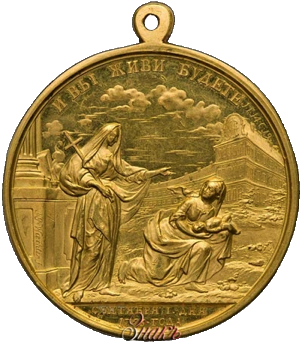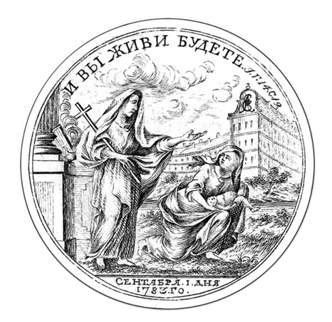 Reverse: И ВЫ ЖИВЫ БУДЕТЕ 1: Г: 14: C: 19 (Ye shall live also St. John 14:19) Faith holding a cross on her shoulder consoling a woman with infant in her hands. Building with the monogram of Catherine II to right, a column with signature of engraver "I•G•WAECHTER•f"( I.G.Waechter fecit); in exergue –СЕНТЯБРЯ 1. ДНЯ. 1763 ГОДА (September, 1st Day, Year 1763)