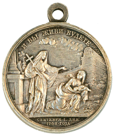 Award medal[25] On the Establishment of the Moscow Foundling House on September 1, 1763 silver, d.28, for presentation to the best employees of the foundling houses, S. Petersburg mint yard, 1880, original by V. Nikonov. Medal instituted in 1808 in reign of Alexander I.